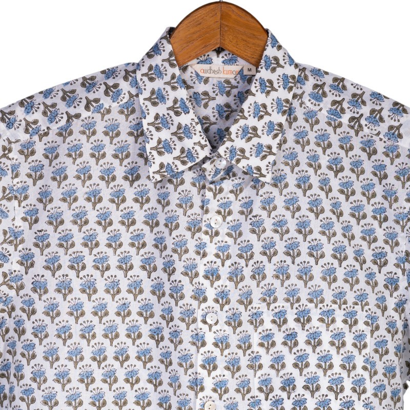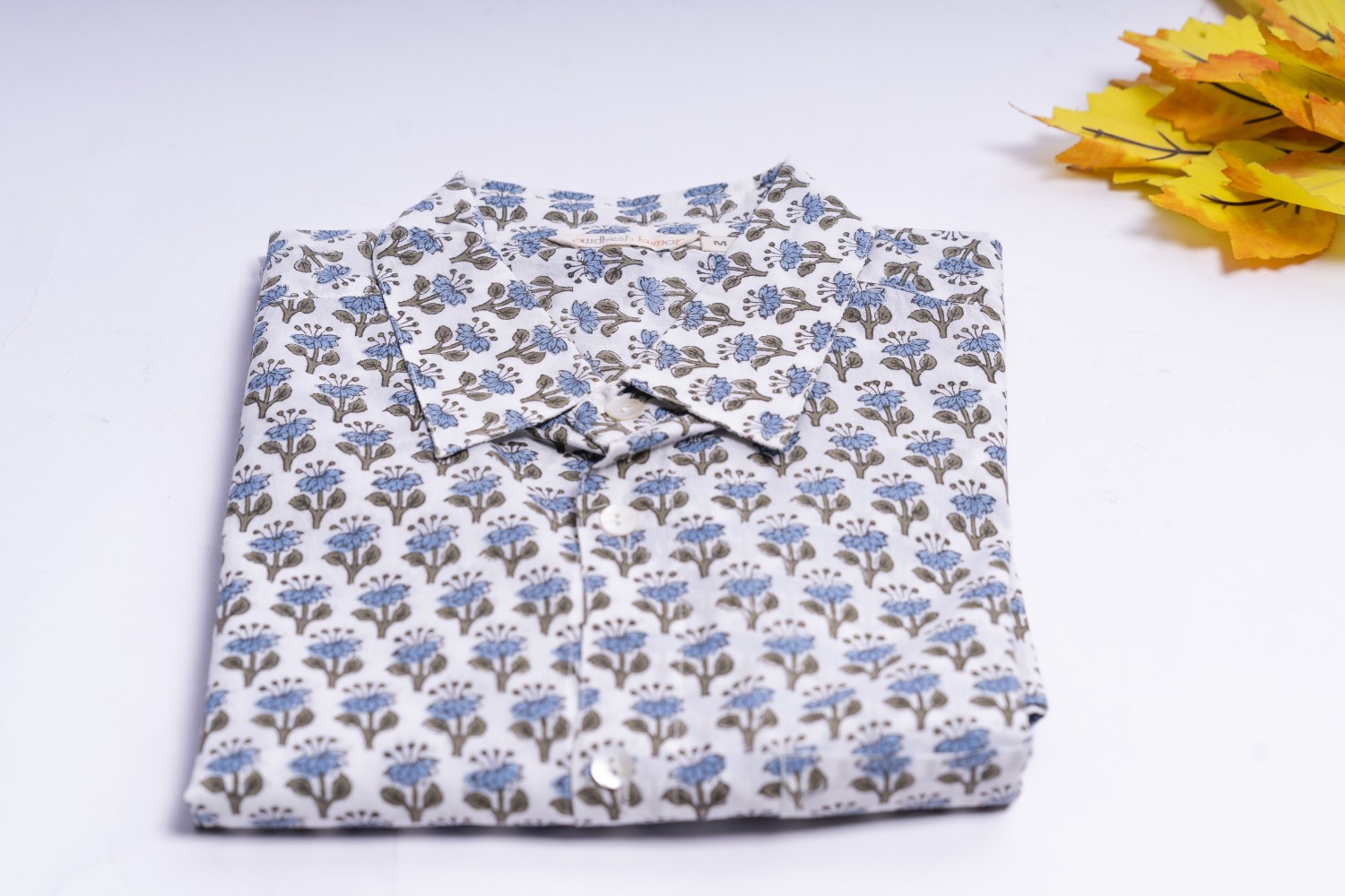 Full Sleeve Indian Hand Block Print Shirt Kalangi Buti Blue Green Design Shirt 100% Cotton Fabric