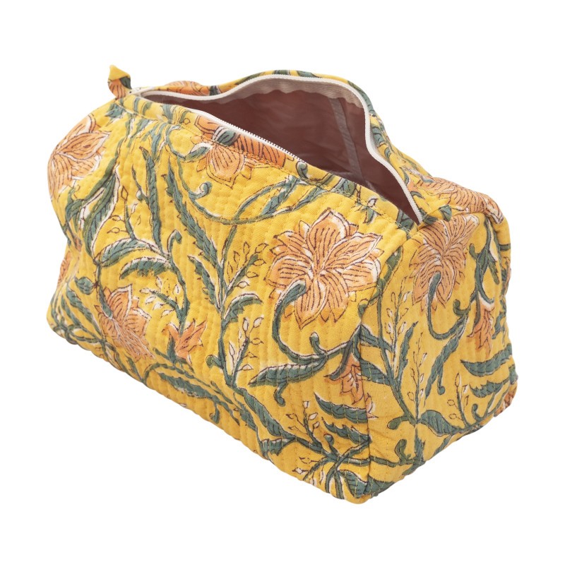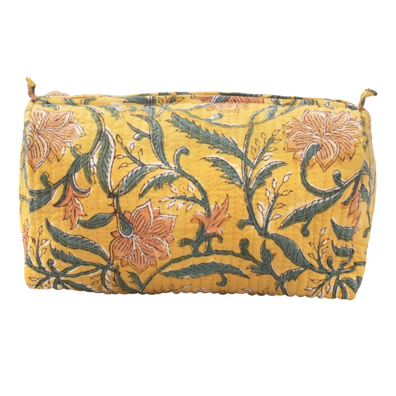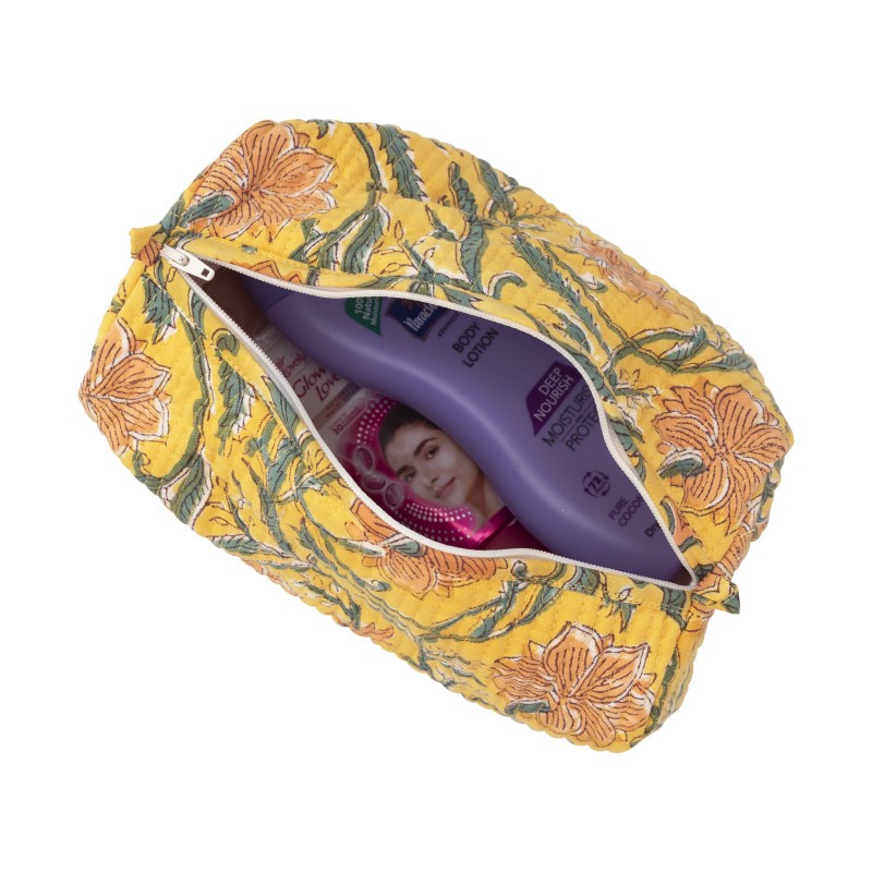 Our handcrafted block-printed cotton quilted makeup and toiletry bags are the perfect blend of style and functionality. Made from high-quality cotton and adorned with intricate hand-printed designs, these bags add elegance to your beauty routine or travel essentials.