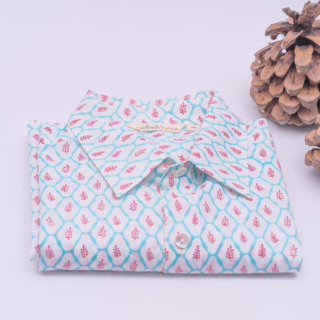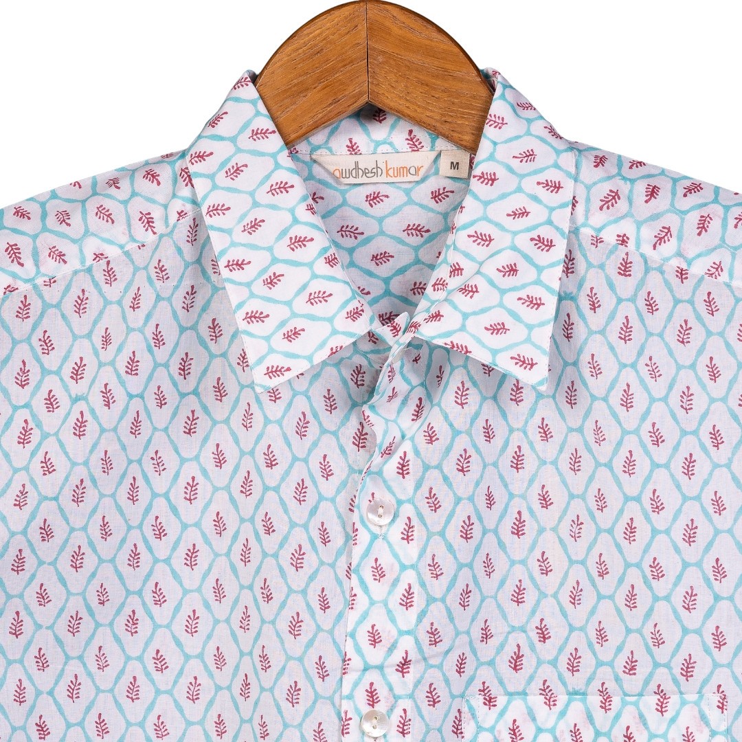 This is hand block printed men's half sleeve shirt, printed by using traditional hand block printing This is hand block printed men's half sleeve shirt, printed by using traditional hand block printing technique, on 100% cotton 60's cambric fabric, with free pigment dyes.
