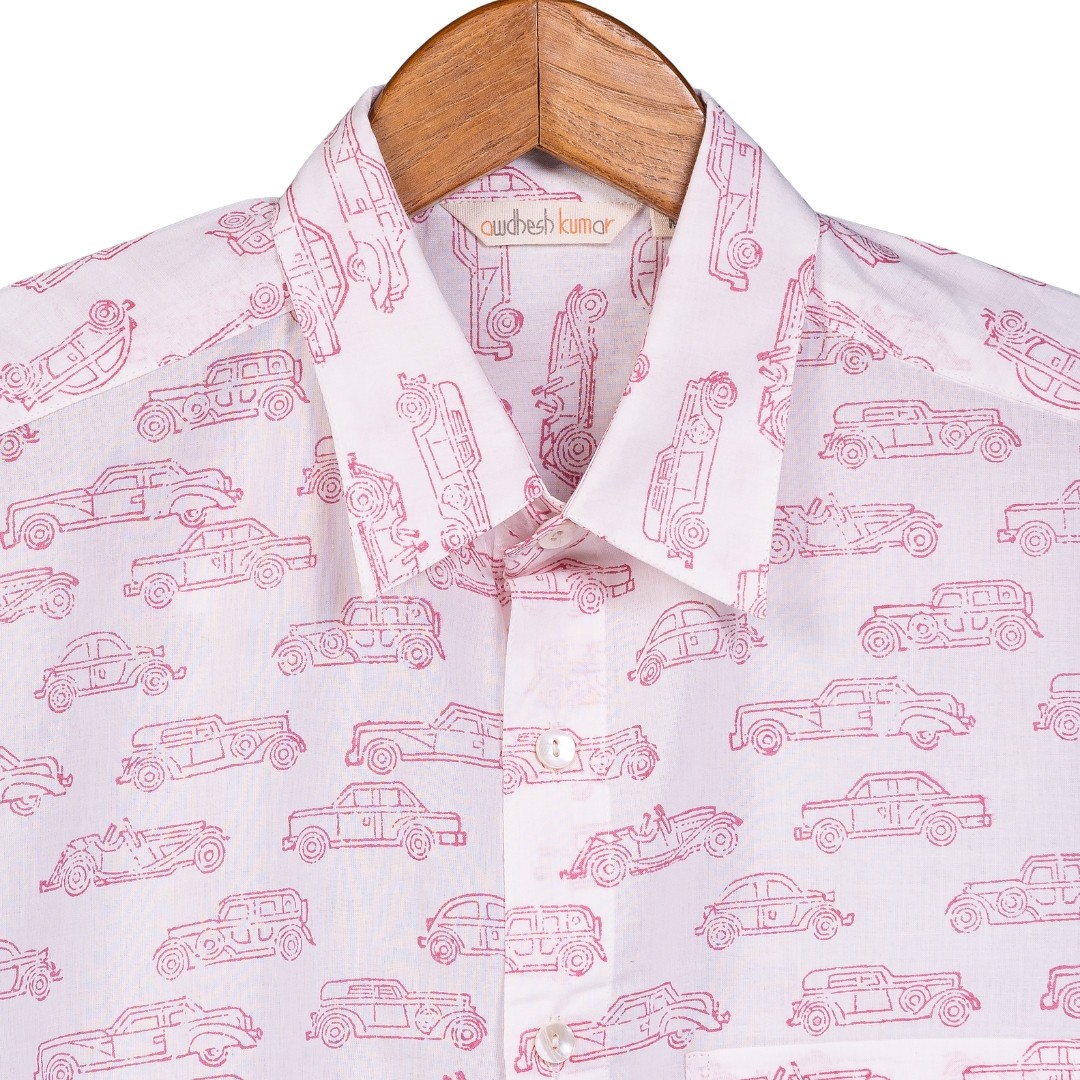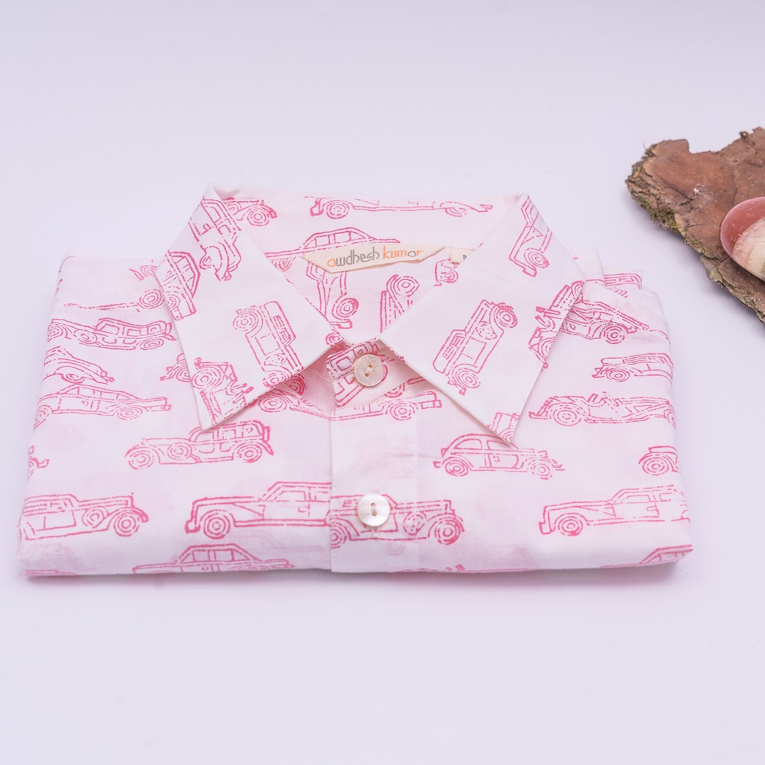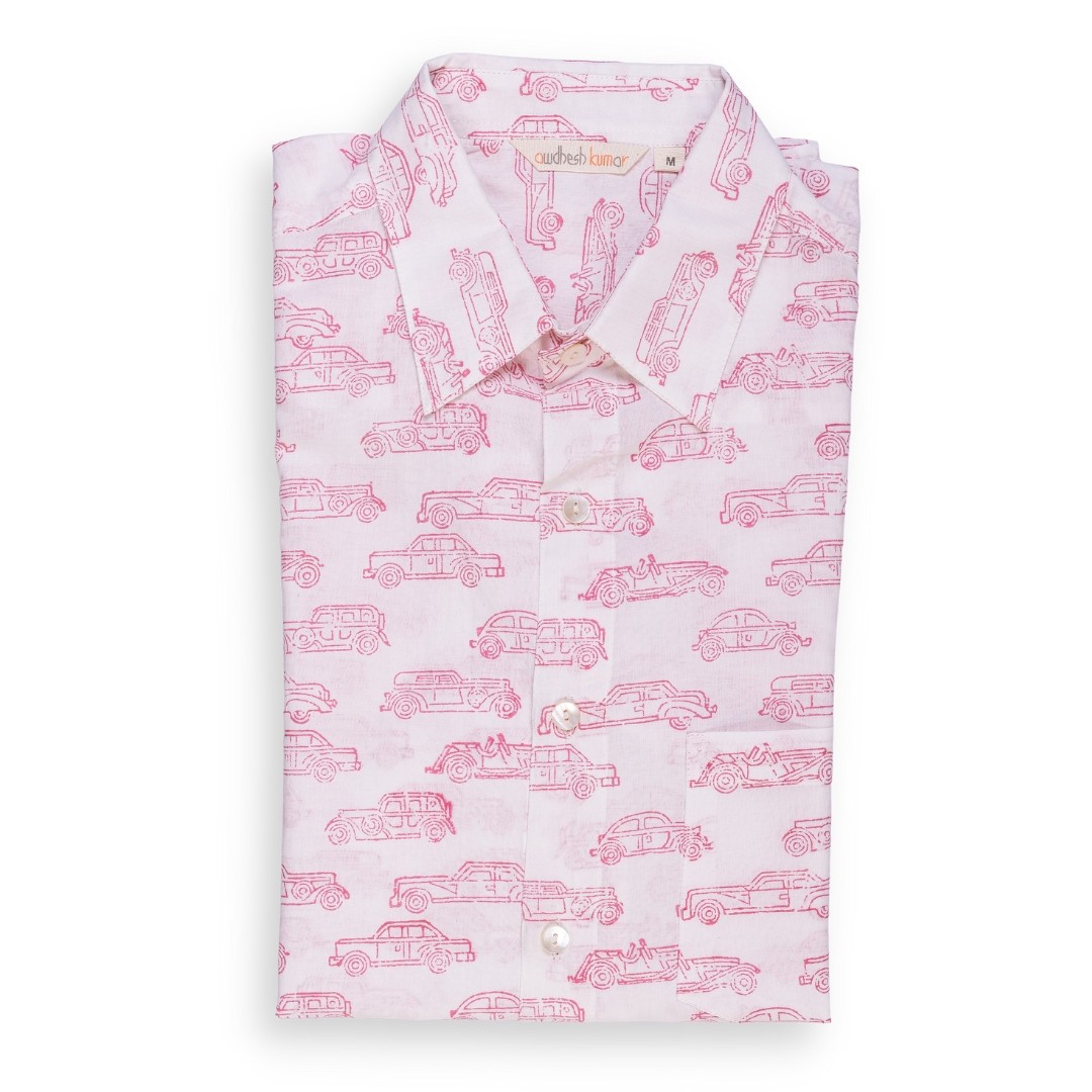 Short Sleeve Indian Hand Block Print Shirt Car Pink Design Shirt 100% Cotton Fabric