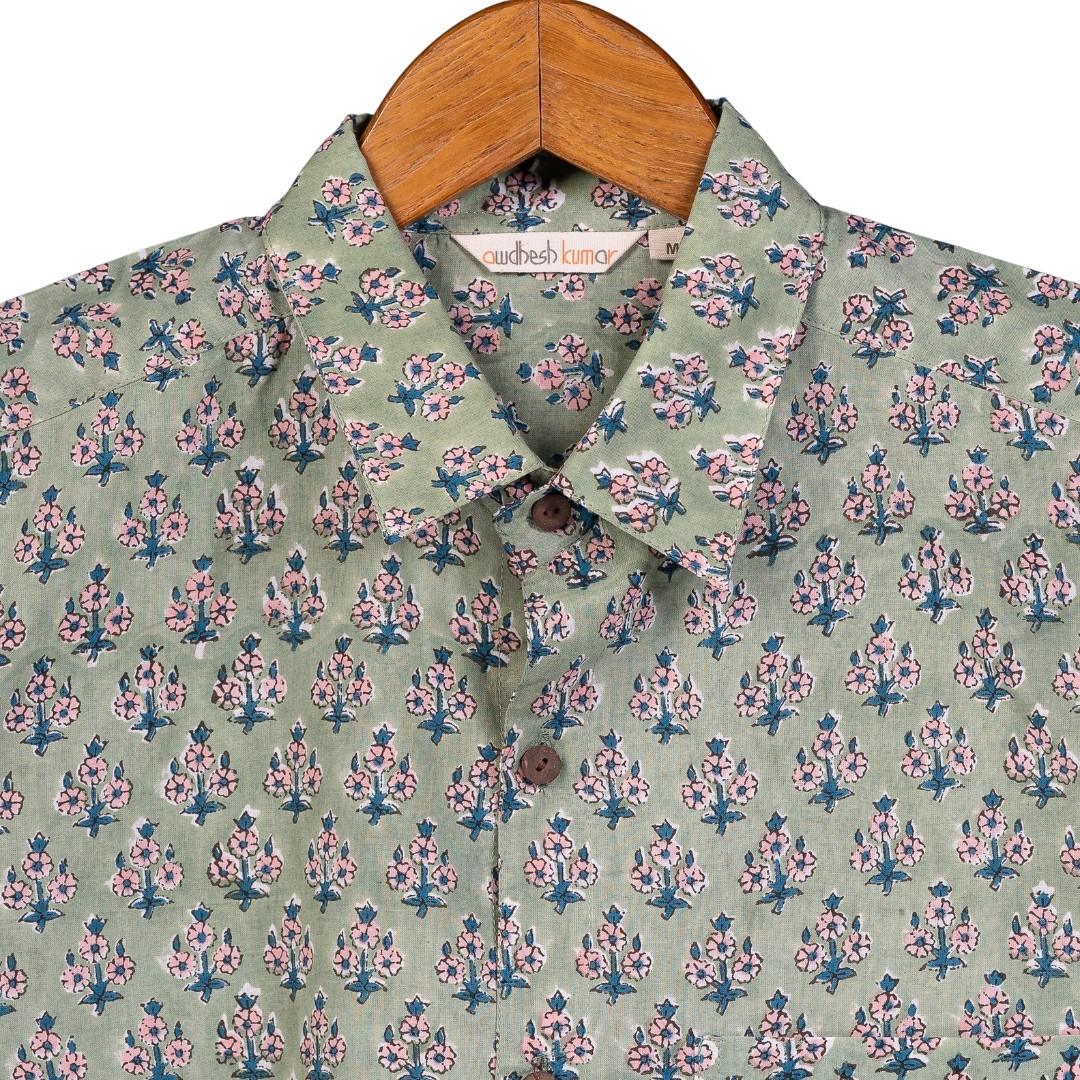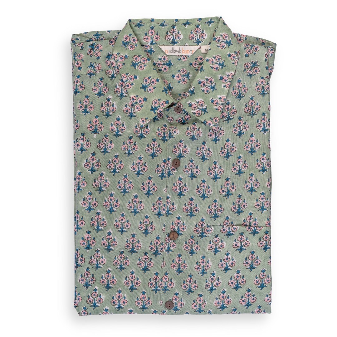 Short Sleeve Indian Hand Block Print Shirt Gud Buti Green Design Shirt 100% Cotton Fabric