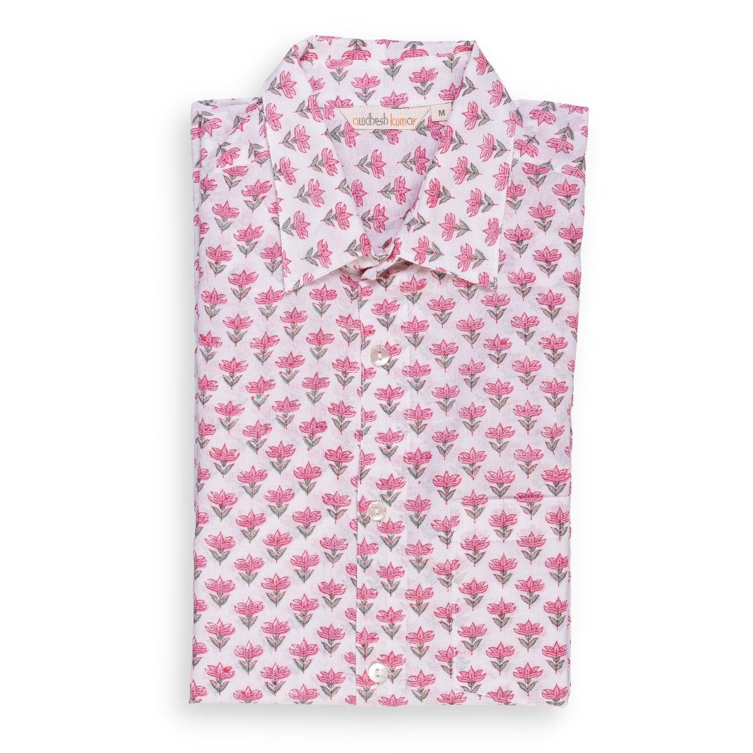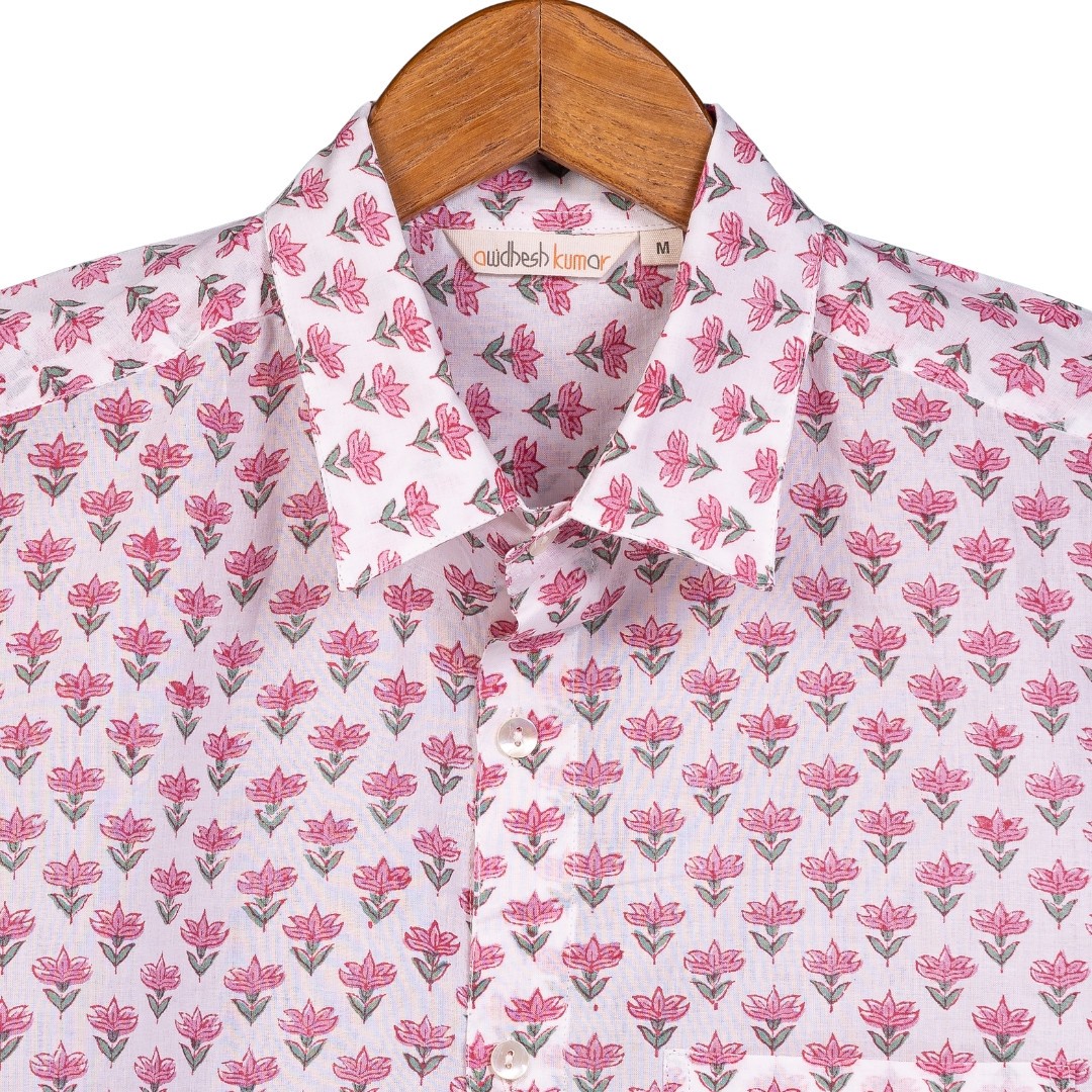 Short Sleeve Indian Hand Block Print Shirt Pink Buti Small Design Shirt 100% Cotton Fabric
