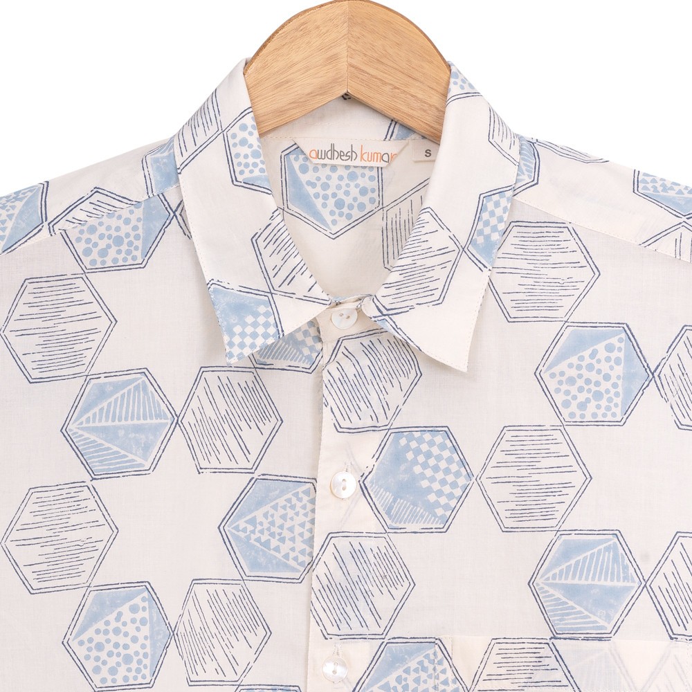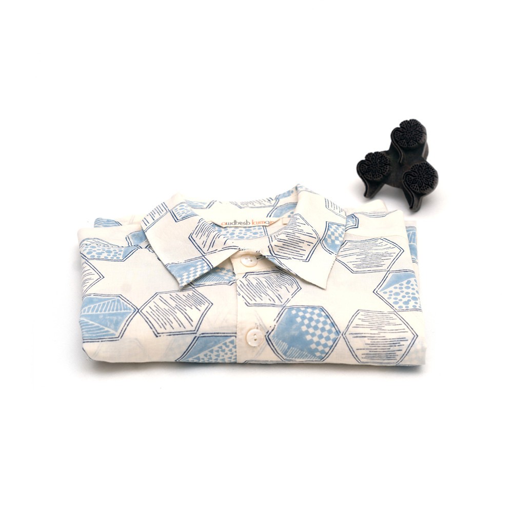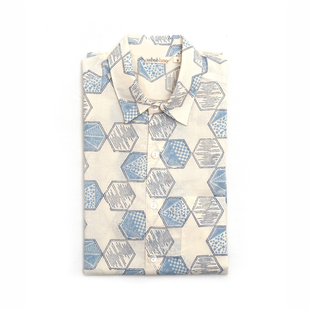 This is hand block printed men's half sleeve shirt, printed by using traditional hand block printing This is hand block printed men's half sleeve shirt, printed by using traditional hand block printing technique, on 100% cotton 60's cambric fabric, with free pigment dyes.